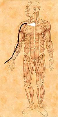 discende all'ascella, si superficializza al torace ove da avvio al tragitto esterno.